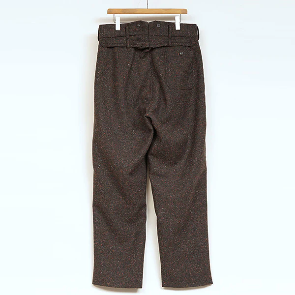 ブラックスミス(鍛冶職人)が着用していたドニゴールツイードを現代に蘇らせました。ターゲットとしたオリジナルのファブリックは、文字通りアイルランドのドニゴール地方で生産されたホームスパン(家庭で原毛を手染めして紡ぎ、不揃いの毛糸を使って手織りした厚手の毛織物)で、太さや撚糸にムラがある糸をそのまま織り込んでいくためファブリック全体に味わいのあるネップが生じている事が特徴です。また、赤い粒のネップが混ざっていますがこれは落としネップと呼ばれるもので着用を繰り返すうちに次第に脱落していき、経年変化をお楽しみ頂けます。